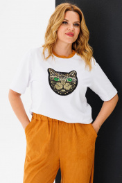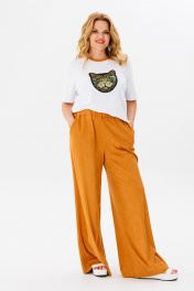 Универсальный и удобный женский брючный костюм для повседневной носки. Футболка свободного кроя, выполнена из мягкой приятной на ощупь хлопковой ткани. Округлая контрастная горловина, рукав укороченный. По переду изделие украшено нашивкой. Брюки-палаццо идеально сидят на любой фигуре, подчеркивая все достоинства и скрывая недостатки. Брюки выполнены из прятной хлопковой ткани (штрукс). Изделие свободного кроя, длинные, на притачном поясе с резинкой. По переду два кармана в боковых швах. Оба изделия смело можно сочетать с другими вещами Вашего гардероба и любой по стилю обувью. Длина футболки по спинке 60 см, длина рукава от плечевого шва 28 см. Длина брюк по боковому шву 111 см +-1 см, по шаговому 81 см +-1 см. Изделие подойдет на рост 170 см.