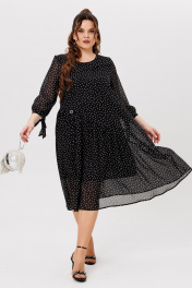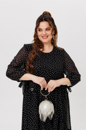 Нарядное двухслойное платье в классической расцветке (черное в белый горох) на облегченной подкладке — идеально подойдёт для любых торжеств. Интересная расцветка, легкий и струящийся шифон, а завязки на рукавах — сделают изделие еще более выразительным. Платье с округлой горловиной, длина ниже колена и трапециевидный крой — подчеркнут Ваши достоинства и не будет сковывать движения. По переду косой подрез и волан на сборке из-под него, украшено кольцом со стразами; спинка прямая. Платье прекрасно дополняется различными аксессуарами. Длина изделия 110 см (+-1 см), длина рукава 49 см. Изделие подойдет на рост 170 см.