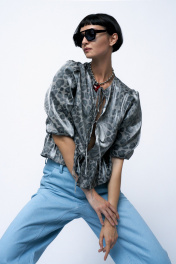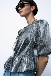 Блуза с баской по низу, рукавом-буфом и завязками по переду. Рисунок Леопардовый Вырез горловины - округлый вырез. Особенности ткани- блеск. Фактура материала шелковистая. Вид застежки: завязки.