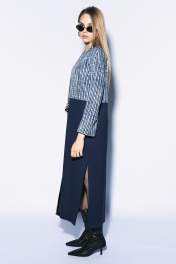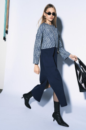 Платье длиной миди полуприлегающего силуэта, отрезное по линии талии, нижняя часть платья прямого силуэта с небольшим заужением к низу. Перед со средним швом. Горловина обработана бейкой. Рукав реглан двухшовный длинный с небольшим расширением к низу. В боковых швах нижней части платья расположены карманы, а также разрезы.
