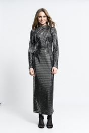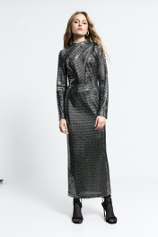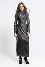 Платье прилегающего силуэта, со сборкой в области плеча и талии. Юбка - миди. Застежка сзади - потайная молния.
