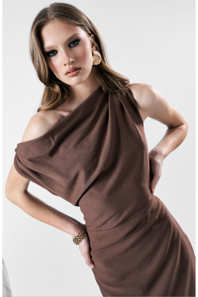 Платье прилегающего силуэта, с асимметричным вырезом горловины, длина "миди". Верхняя часть платья - отрезная. По плечевым срезам оформлены декоративные складки. Юбка с разрезом сзади.