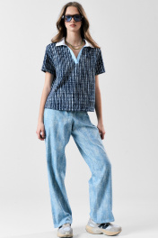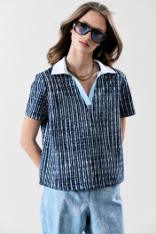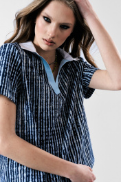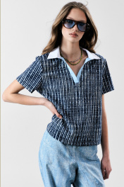 Футболка-поло с белым хлопковым воротником и голубой планкой.Прямой силуэт. Два универсальных размера - S (42-44-46). M (48-50-52)