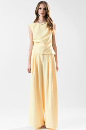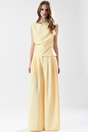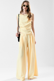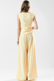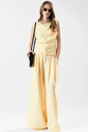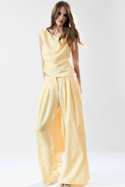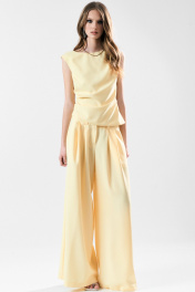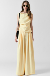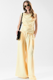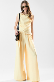Брюки-палаццо с двумя глубокими встречными складками. Карманы в боковых швах. Сзади для лучшей посадки сделаны выточки. Застежка на брюках крючок и молния.
