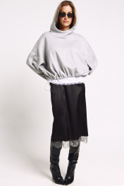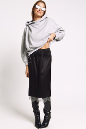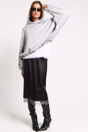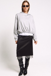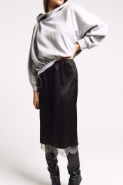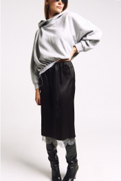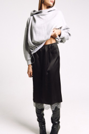 Юбка прямого силуэта на подкладке, к низу пожкладки притачано французское кружево в цвете "графит". Сзади юбки - высокий разрез. Два универсальных размера - S (соответствует 42-44-46), L (соответствует 48-50-52)