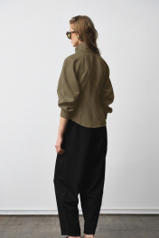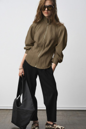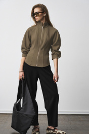 Джемпер прилегающего силуэта с воротником-стойкой, по рукаву заложенны конструктивные складки, образующие сборку. Застежка - на металлическую молнию. Материал - плотный трикотаж в рубчик. Два универсальных размера - S (соответствует 42-44-46), L (соответствует 48-50-52)