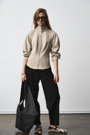 Джемпер прилегающего силуэта с воротником-стойкой, по рукаву заложенны конструктивные складки, образующие сборку. Застежка - на металлическую молнию. Материал - плотный трикотаж в рубчик. Два универсальных размера - S (соответствует 42-44-46), L (соответствует 48-50-52)