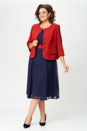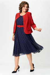 Комплект женский, состоящий из жакета и платья. Жакет приталенного силуэта. Округлый вырез горловины и борта. По полочке-карманы с листочкой и клапанами. Рукав втачной, с разрезами по низу. По переду-застёжка на петли-пуговицы. Жакет без подкладки (летний вариант). Платье приталенного силуэта, со свободной юбкой, на подкладке. Округлый вырез горловины. Рукав втачной, короткий. Застежка на молнию в боковом шве. В комплекте-пояс в цвет жакета. Длина по спинке жакета-53см, длина рукава-30см. Длина по спинке платья-113см, длина рукава-19см.