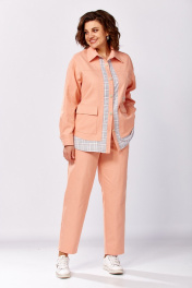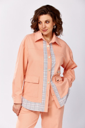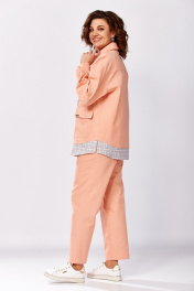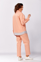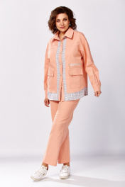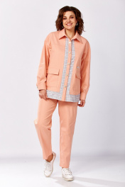 Костюм женский, состоящий из рубашки и брюк. Рубашка свободного силуэта. Рукав спущенный, низ обработан манжетой. По переду накладные карманы с клапанами и молнией для декора (не функциональные). Воротник рубашечного типа. Спереди застежка на петли и пуговицы. Брюки-бананы, заужены к низу. Талия на резинке, в боковых швах – карманы, изделие без застежки. Длина рукава от горловины - 76 см, длина куртки - 64 см (основной) и 71 см (с отделочной частью). Длина брюк по боковому шву - 98 см.