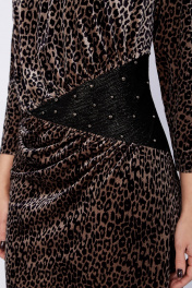 Женское платье полу-прилегающего силуэта, выполнено из велюровый с принтом. Вырез горловины имеет v-образную форму, на обтачке. По линии талии выполнен подрез из декоративной ткани, от подреза выполненны складки по полочке. Вставка по линии талии декорирована бусинами. Спинка выполнена из основной ткани, со средним швом и вытачками. Рукав оптимальный длины, втачной, выполнен из основной ткани. Эффектное платье для обладательниц роскошных форм, прекрасно подойдёт для любого мероприятия. в 60р. Ширина груди- 61см, Ширина талии -56см, Ширина бедер- 65см, длина рукава- 49см, ширина рукава 21,5см.
