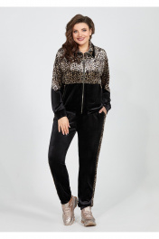 Спортивный костюм выполнен из принтованного и однотонного велюра. По переду выполнена застежка на тесьму-молнию, горловина обработана воротником-стойкой. Также на полочке выполнен горизонтальный подрез, нижняя часть из однотонного велюра на ней выполнены прорезные карманы с молнией. Спинка выполнена из принтованного велюра, низ кофты на планке из однотонного велюра. Рукав втачной, выполнен из однотонного и принтованного велюра, низ рукава на манжете. Брюки выполнены из однотонного велюра, по боковым вставка из принтованного велюра, в боковых швах карманы. Верхний срез на резинке, по низу брюки на манжете. Стильный, современный костюм, выполнен из стрейчевой ткани, трендовая новинка этого сезона! в 52р. Куртка: ширина груди 56см, ширина пояса 50см, длина рукава 73см, ширина рукава 22см. Брюки: Ширина талии 40см, Ширина бедер 58см. Длина куртки 58см, длина брюк по боковому шву 102см, длина брюк по внутреннему шву 75см.