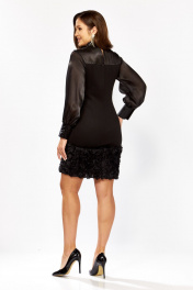 Эффектное женское платье полуприлегающего силуэта, выполнено из трикотажного полотна и органзы. Лиф платья отрезной по линии талии, кокетка лифа выполнена из органзы, нижняя часть из трикотажного полотна, с рельефами. Юбка платья прямого покроя, выполнена из трикотажного полотна, по низу притачная планка из декоративной ткани с объемными розами. Спинка идентична полочке, со средним швом, по горловине обработана стойка из органзы, по спинке застегивается на петлю-пуговицу. Рукав на спущенной пройме, из органзы, по низу присборен на манжет с застежкой на петли-пуговицы. Стильное платье с эффектным декором отличный выбор для торжественных мероприятий! в 46р. Ширина груди- 46см, Ширина талии -40см, Ширина бедер- 50см, длина рукава- 65см, ширина рукава 21см.