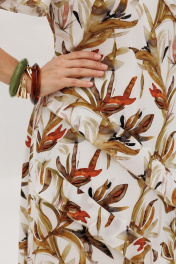 Летнее платье полуприлегающего силуэта, выполнено из штапеля с принтом, на подкладке. Горловина фигурной формы, на обтачке, также на полочке обработаны кокетки, от кокетки и горловины идут воланы из основной ткани. Также на полочке выполнены ассиметричные подрезы с воланами. Рукав втачной, расклешенный, выполнен из основной ткани, оптимальной длины. Спинка с средним швом и вытачками, в среднем шве потайная молния, платье к низу расклешенное. Легкое, летнее платье из приятной к телу ткани отличный выбор для летнего дня! в 52р. Ширина груди- 54см, Ширина талии -52см, Ширина бедер- 62см, длина рукава- 24см, ширина рукава 23см. Длина изд. в см 122.