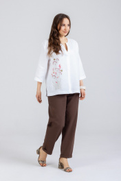 Стильные Брюки -Бананы изготовлены из качественного льна с эффектом мятости. Брюки летнего ассортимента, свободные ,застёгиваются на молнию.По переду внутренние карманы. Сзади накладные карманы. Очень удобные. Отворот не закреплён. Подходят как на рост 164, так и на рост 170. Застёгиваются на молнию и 2 пуговицы. В задней части пояса и частично по переду вставлена резинка. Посадка: средняяДлина брюк по боковому шву с поясом 100-103 см . Длина пояса ( резинка в растянутом виде): 46 р.-82 см, 48 р.-86 см, 50 р.-91 см, 52 р-95 см, 54 р-100 см. Хорошо сочетаются в комплекте с м 1293 Туника- белый лён, 1181 Блузон-шоколад.