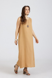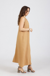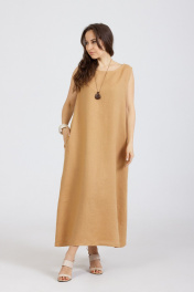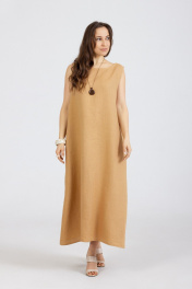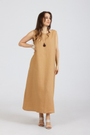 Платье прямого свободного кроя выполнено из натурального мягкого льна "с эффектом мятости" , без рукавов, вырез горловины круглый, горловина и проймы окантованы . В боковых швах карманы.