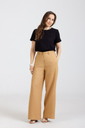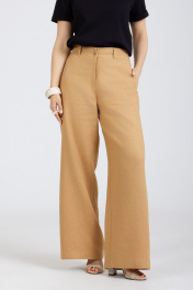 Брюки "палаццо" свободные от бедра изготовлены из натурального льна с "эффектом мятости". По переду внутренние карманы. Очень удобные. Застёгиваются спереди на молнию и 2 пуговицы. В задней части пояса вставлена резинка. Посадка: высокая . Длина пояса ( резинка в растянутом виде): 46 р.-80 см, 48 р.-86 см, 50 р.-89 см, 52 р-93 см, 54 р-97 см, 56р-104 см .