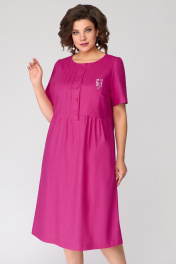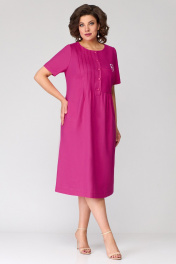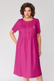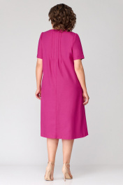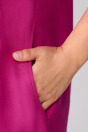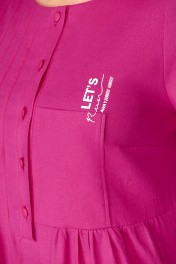Платье с частичной застежкой на петли и пуговицы. По левой части переда накладной карман и подрез, по правой части переда декоративные защипы. В боковых швах карманы. Спинка с защипами по верху. Рукав втачной короткий с небольшой сборкой по верху. Длина платья 108 см, длина рукава 26 см