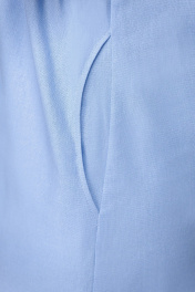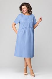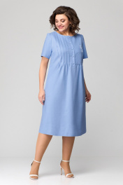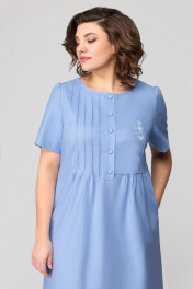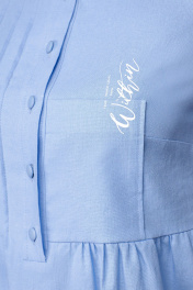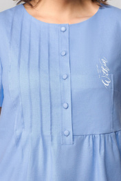 Платье с частичной застежкой на петли и пуговицы. По левой части переда накладной карман и подрез, по правой части переда декоративные защипы. В боковых швах карманы. Спинка с защипами по верху. Рукав втачной короткий с небольшой сборкой по верху. Длина платья 108 см, длина рукава 26 см