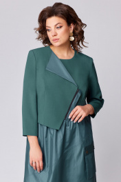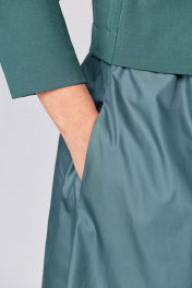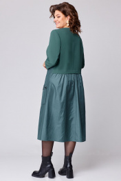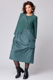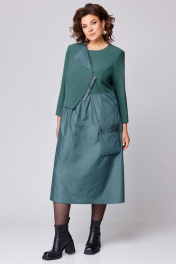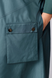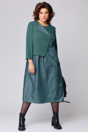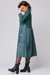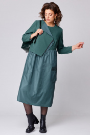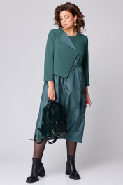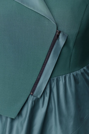 Платье женское А- силуэта. Рукав втачной, двухшовный. По переду отлетная деталь имитирующая «косуху», с декоративной, не функциональной застежкой – молнией. Горловина округлой формы, воротник апаш из отделочной ткани. По линии талии подрез. Нижняя часть платья со сборкой, на подкладке. Выполнена из отделочной ткани с отстрочными швами, накладным карманом с клапаном на две петли и пуговицы. Карман функциональный. Спинка со средним швом, отрезная по линии талии, со сборкой из отделочной ткани. В верхней части спинки потайная молния. Длина изделия по спинке 115см. Длина рукава 52см.