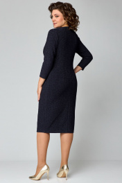 Элегантное женское платье полуприлегающего силуэта из трикотажного полотна с мерцающим блеском.V-образный вырез горловины, по переду имеется средний шов. Отрезная деталь переда по линии груди с имитацией «перекрута». Спинка со средним швом и талиевыми вытачками. Спереди расположен разрез. Рукав втачной, одношовный длиной 7/8.