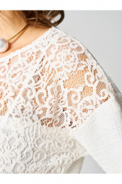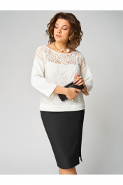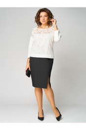 Комплект, состоящий из туники и юбки. Туника полуприлегающего силуэта, выполнена из трикотажного полотна. По переду вставка из кружева, под низом топ на бретелях только по переду. Округлый вырез горловины. Линия плеча спущена, рукав одношовный. Спинка со средним швом. Длина рукава от горловины - 58 см, длина по спинке - 56 см. Юбка прямого силуэта с разрезом спереди, на подкладке. По переднему и заднему полотнищу талиевые вытачки. Застежка сзади на потайную тесьму-молнию и пуговицу. Длина юбки по боковому шву - 64 см.