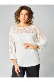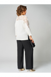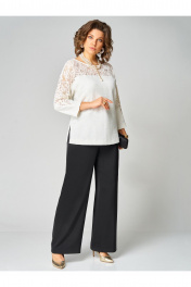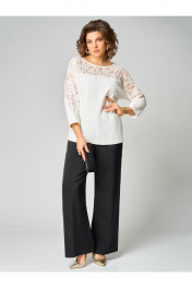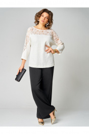 Комплект женский двухпредметный, состоящий из туники и брюк. Туника выполнена из трикотажного полотна. Округлый вырез горловины обработан бейкой. По переду и по спинке отрезная деталь и цельнокроеный рукав из кружева. Спинка со средним швом, по бокам разрезы. Длина рукава от горловины – 57 см, длина спинки - 66 см. Брюки прямые из сатина. Длина брюк по боковому шву без пояса – 104 см. Брюки на поясе, по бокам резинка и косые карманы.