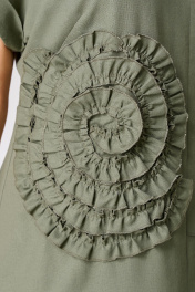 Платье женское прямого силуэта выполнено из льняной ткани. V-образный вырез горловины. Перед со средним швом, с нагрудными вытачками из бокового шва. По правой стороне настрочен декоративный элемент в виде цветка. Спинка со средним швом. Рукав цельнокроеный с отложной манжетой. Длина изделия по спинке-111см, длина рукава от горловины-29см.