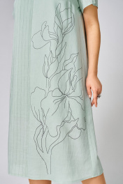 Платье женское А-силуэта выполнено в сочетании однотонной ткани и полоски из льняной ткани с вискозой. Округлый вырез горловины. Перед со средним швом, с нагрудными вытачками. По левой стороне переда из однотона расположена авторская печать. Спинка со средним швом и разрезом по низу. Рукав втачной , одношовный. Длина изделия по спинке-111см, длина рукава от горловины- 23 см. Платье на трикотажной подкладке.