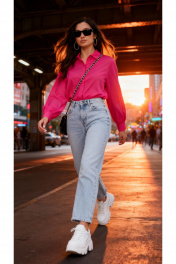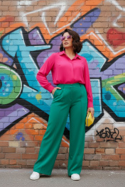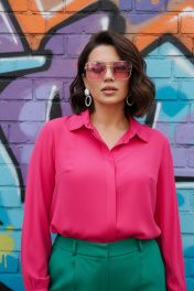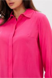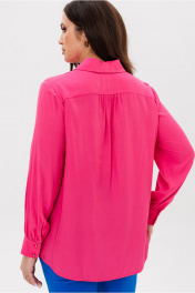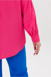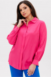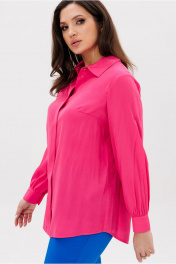 Блуза свободного силуэта. По переду планка с потайной застёжкой на семь прорезных петель и пуговиц. По спинке кокетка со сборкой. Рукава одно шовные втачные, на широкой манжете с двумя складками. Воротник отложной на стойке. Боковые швы блузы заканчиваются небольшими разрезами.
