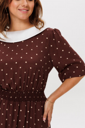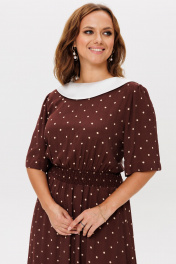 Платье полуприлегающего силуэта , расклешенное к низу, отрезное по линии талии со вставленным поясом на "венгерке". Рукав одношовный, втачной. Воротник плосколежащий, переходящий на спинке в рельефы, заканчивается бантом. Застежка на тесьму-молнию в среднем шве спинки до воротника.