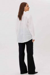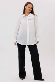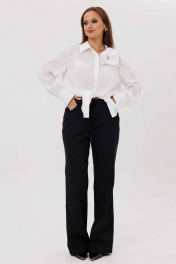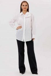 Блуза женская, прямого силуэта с потайной застежкой. Перед с нагрудными вытачками. Спинка с отрезной кокеткой. Воротник рубашечного типа, с отрезной стойкой. Рукав тачной, одношовный, с манжетой по низу. Низ фигурный. Дополняет модель декоративный цветок (съемный, пуговица).