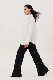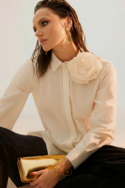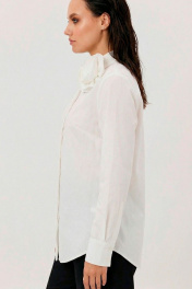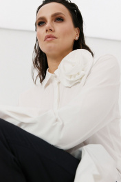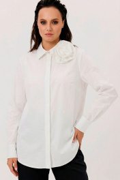 Блуза женская, прямого силуэта с потайной застежкой. Перед с нагрудными вытачками. Спинка с отрезной кокеткой. Воротник рубашечного типа, с отрезной стойкой. Рукав тачной, одношовный, с манжетой по низу. Низ фигурный. Декоративный цветок (съемный, пуговица).