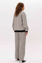 Костюм женский, состоящий из бомбера и брюк. Бомбер свободного силуэта, застежка на центральную тесьму-молнию, по переду обработаны прорезные карманы с кантом. Рукава-реглан. Горловина, рукава и низ изделия обработаны отделочной тканью. Бомбер на подкладке. Брюки слегка заужены к низу, пояс на резинке. Боковые карманы с отделочным кантом.