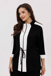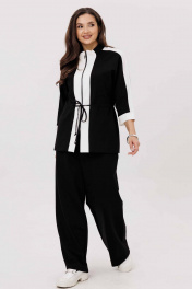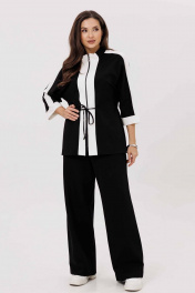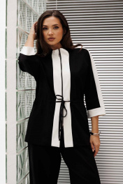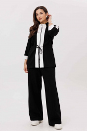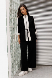 Костюм женский, состоит из жакета и брюк. Жакет прямого силуэта, с застежкой на декоративную тесьму-молнию по центру. На талии кулиса на завязке. Рукав «Летучая мышь», низ рукава обработан притачной манжетой. По верху рукава и центру переда контрастные вставки. Жакет без подкладки. Брюки палаццо, на притачном поясе с резинкой и тесьмой. У брюк - боковые карманы.