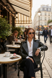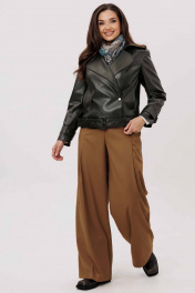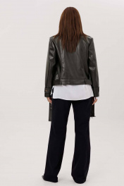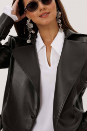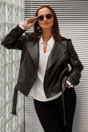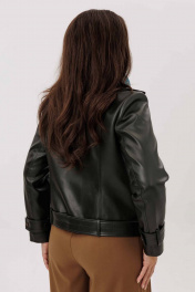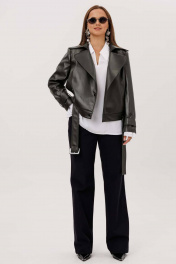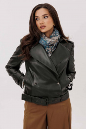 Жакет женский, укороченная, прямого силуэта на подкладке, выполнена из качественной экокожи. Застёжка двубортная на кнопки. По переду рельефы от плеча до низа и прорезные карманы с листочкой. Спинка с рельефами от плеча до низа. По низу куртки приточная планка со шлёвками, в которые продет пояс с пряжкой. Воротник отложной на стойке. Рукава двух шовные втачные, по низу паты продеты в шлёвки на кнопках.