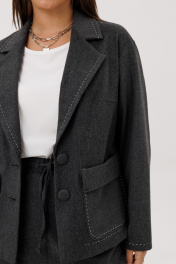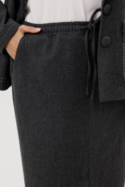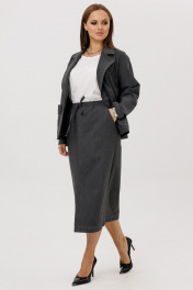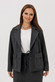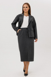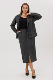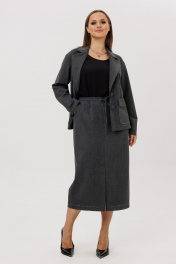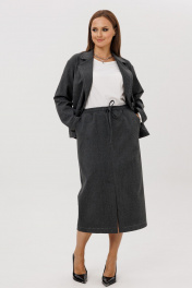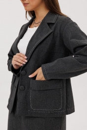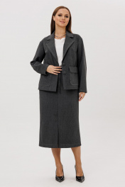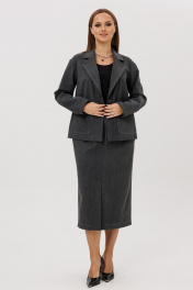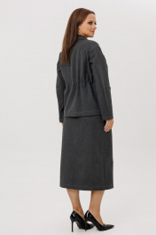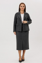 Костюм женский, состоит из жакета и юбки. Жакет прямого силуэта с однобортной застежкой на 2 петли-пуговицы. Воротник пиджачного типа, перед с нагрудными вытачками и накладными карманами. Спинка с потайной кулисой, затягивающейся внутри. Рукава втачные, 2х шовные. Юбка прямая на резинке и завязке, с центральным швом, заканчивающимся разрезом. Жакет и юбка отстрочена декоративной контрастной строчкой.
