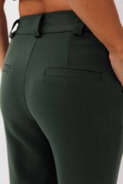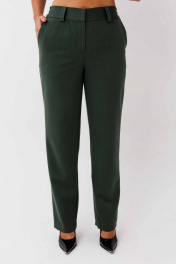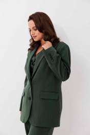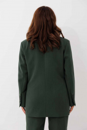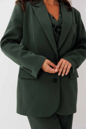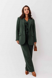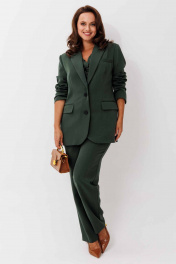 Элегантный женский костюм, состоящий из жакета и прямых брюк, выполнен из костюмной однотонной ткани. Жакет однобортный, на петлях и пуговицах, с английским воротником и клапанами по бокам. Рукав втачной, длина — полная. Посадка свободная, что обеспечивает комфорт и стильный силуэт. Брюки прямого кроя, на частичной резинке по поясу для удобной посадки и идеального прилегания. Костюм на подкладке, лёгкий, приятный к телу и подходит как для повседневной носки, так и для офиса или торжественного выхода.