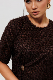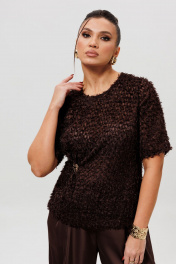 Блуза представлена в трендовом шоколадном оттенке, выполнена из лёгкой ткани травка на шифоновой основе, прямого силуэта. Перед с нагрудными вытачками и декоративным элементом: небольшие складки, которые фиксируются пришивным декоративным элементом. На спинке обработана застёжка на петлю и пуговицу. Рукав втачной. Эта коричневая блузка из ткани-травка — образец уникального дизайна и внимания к деталям. Модель с коротким рукавом украшена изящной золотой пришивной брошью и изысканной сборкой на боку, создающей мягкий объем. Особенность фасона — элегантная застежка-капелька на пуговице на спинке, которая добавляет образу индивидуальности. Блузка выполнена из фактурной ткани, которая выглядит дорого и современно. Идеальный выбор для офиса, деловой встречи или романтического ужина, чтобы подчеркнуть ваш безупречный вкус.