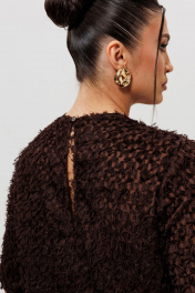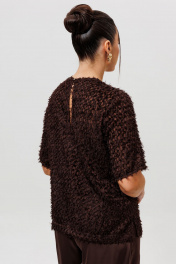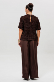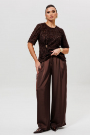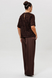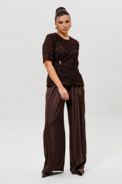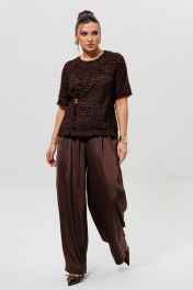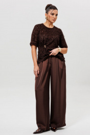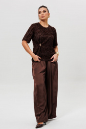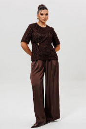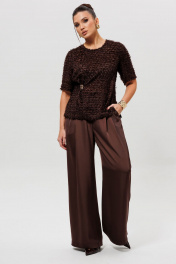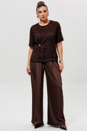Шоколадный костюм женский полуприлегающего силуэта, сотоит из блузы и брюк, Блуза выполнена из эффектной ткани "травка". Прямой силуэт, со сборкой на пришивную брошь на уровне талии. Спинка с застежкой-капелькой на пуговицу на спинке. Брюки прямые, выполнены из атласной ткани, расширены к низу. На передних половинках брюк обработаны 2 складки и боковые карманы. На задних – талиевые вытачки. Застёжка на молнию и 2 потайных крючка.