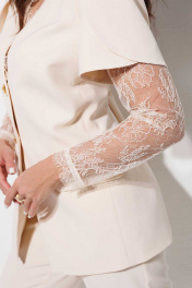 Костюм женский, состоит из жакети и брюк. Жакет полуприлегающего силуэта, с центральной бортовой застежкой на 2 петли-пуговицы. Перед с нагрудными вытачками и карманами в рамку с клапанами. Спинка с талиевыми вытачками, со средним швом, заканчивающимся шлицей. Рукав - двойной из основной и кружевной ткани. Горловина обработана декоративным кружевом. Жакет на подкладке. Брюки женские с высокой посадкой на широком поясе зауженные к низу. По переду прорезные карманы с листочкой, и застёжка молния с гульфиком и откоском. Пояс по спинке на резинке и застёгивается на прорезную петлю и пуговицу.