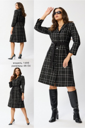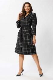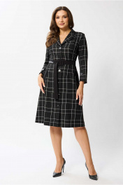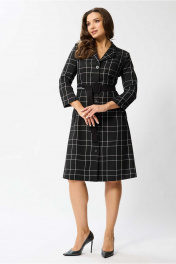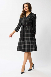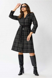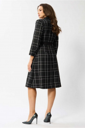 Платье женское полуприлегающего силуэта выполнено из плательной ткани. По переду нагрудные и талевые вытачки, застёжка на пять прорезных петель и пуговиц и прорезные карманы с клапанами. Спинка со средним швом и талевыми вытачками. Рукава двух шовные втачные. Воротник отложной. Дополнением изделия служит пояс с пряжкой. Длина изделия: 103 см. Длина рукава: 53 см.