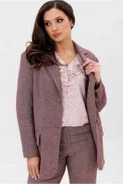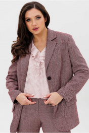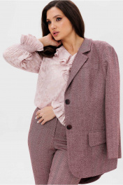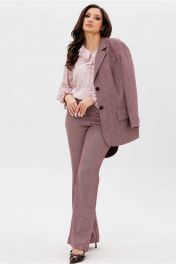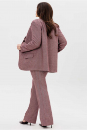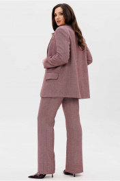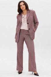 Костюм женский, состоящий из жакета и брюк. Жакет прямого силуэта, на подкладке. Воротник стоячий отложной, с лацканами. Рукав втачной, с иммитацией шлицы по низу. Борта закругленные. На левом борту жакета обработана листочка. Карманы прорезные, в рамку с фигурным клапаном. Спинка со средним швом, заканчивающимся шлицей. Брюки полуприлегающего силуэта, расширенные от колена. Пояс притачной с широкими шлевками. Застежка в среденм шве переда на молнию и два крючка. Брюки с боковыми карманами.