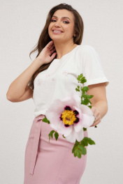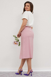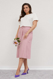 Комплект женский состоит из блузы(хлопок) и юбки. Блуза со спущенными плечами свободного облегания. Украшением блузы служит декоративная печать. Юбка, слегка расклешённая к низу, на обтачке, без подкладки. По переду рельефы от талии до низа, заканчивающиеся шлицами с разрезом. По заднему полотнищу юбки талевые вытачки, центральный шов и застёжкой на потайную тесьму-молнию.