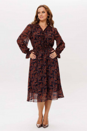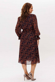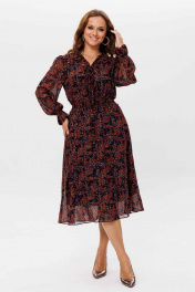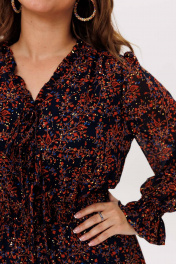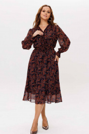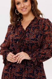 Платье женское свободного силуэта, отрезное по линии талии, расклешённое к низу, выполнено из ткани шифон. По линии талии сборка на резинку «венгерку». Горловина v-образная с небольших рюшей по переду до линии талии на завязках. Рукава одно шовные втачные, по низу сборка на резинку «венгерку». Платье на тонкой трикотажной подкладке.