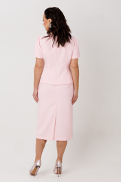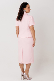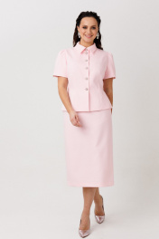 Элегантный женский костюм классического кроя. Комплект состоит из жакета и юбки-карандаш. Жакет полуприлегающего силуэта, спинка со средним швом. По конструкции предусмотрена центральная застежка на 8 пугович. воротник стоячий отложной. Рукава втачные, со сборкой по окату. Юбка длиной миди, слегка зауженная к низу со шлицей. Пояс юбки на обтачке, застежка на тесьму-молнию, пояс частично на резинке по бокам. Жакет и юбка на подкладке.