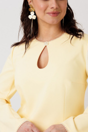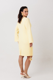 Элегантное платье-футляр, выполненное из плотной плательной ткани на подкладке. Дизайн акцентирован декоративной бейкой с жемчужным оформлением на горловине и манжетах рукавов — технически точная обработка краев, обеспечивающая долговечность и эстетику. Центральная деталь — пуговица-застежка на горловине, формирующая изысканный вырез-капель с эффектом глубины. Конструктивные особенности: Прямой крой с приталенным силуэтом подчеркивает фигуру, сохраняя строгую линию. Спинка выполнена без декоративных элементов (простая конструкция, соответствующая стандартам швейного производства). Идеально для официальных мероприятий, деловых встреч и вечерних образов. Сочетает классические элементы костюмной моды с современными деталями, характерными для трендов 2026 года.