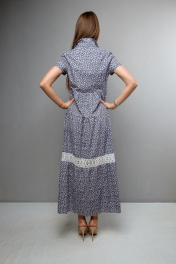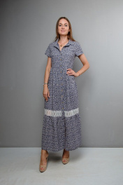 Комплектация: Платье Характеристика: Платье отрезное по линии талии. Застежка планка на пуговицах. Отложной воротник. Рукав крылышко. 3 волана.