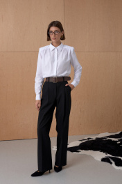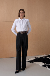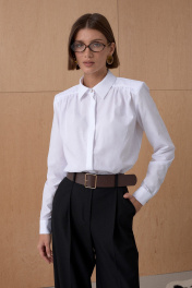 Рубашка из хлопковой ткани с усиленной линией плеча. Свободный силуэт за счет сборки по переду. Длина от плечевой точки у основая шеи 62 см. Состав 66% хлопок, 31% нейлон, 3% спандекс.