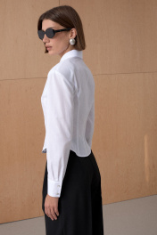 Блуза из хлопка с имитацией корсетной формы по талии. Усиленная и расширенная форма плеча. Длина от плечевой точки у основая шеи 54 см. Состав 66% хлопок, 31% нейлон, 3% спандекс.