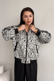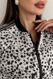 Бомбер из жаккардового полотна. Декорирован лентами. Довязи по горловине, низу изделия и рукавам. Крупная застежка молния. Бомбер на подкладке. Длина бомбера 64 см, длина рукава от воротника 74 см. ОГ 42-44 р-р 126-128 см, 46-48 р-р 134-136 см. Состав вискоза 55%, ПЭ 25%, люрекс 20%